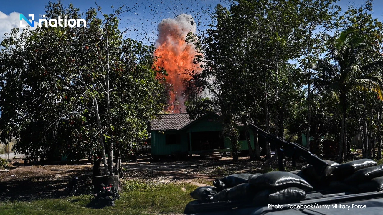 Thai marines say an F-16 carried out an air strike on a Cambodian-built casino complex and a nearby residence in Ban Tha Sen, Laem Klud subdistrict, Trat, before ground forces moved in to secure the encroached area.