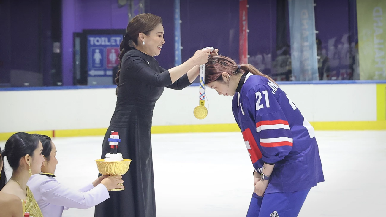 Her Majesty Queen Suthida Bajrasudhabimalalakshana attended the women’s ice hockey final at the 33rd SEA Games, where the Thai team delivered an outstanding performance, defeating the Philippines 13-4 to secure the gold medal.